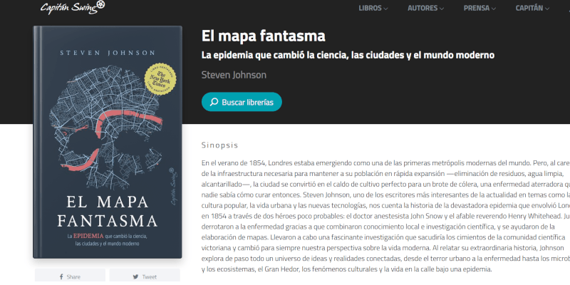 Capitán Swing nos presenta El mapa fantasma, una reconstrucción de científico y divulgador Steven Johnson de la epidemia de cólera que asoló Londres en el verano de 1854, donde una combinación de factores sociales y demográficos hizo estallar un problema de salud pública de primer orden
