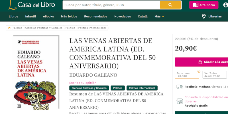 Se trata del libro más icónico del periodista y escritor uruguayo Eduardo Galeano, en donde ya hace más de cuatro décadas denunciaba el expolio de todo tipo de riquezas que llevaban a cabo las empresas occidentales.
